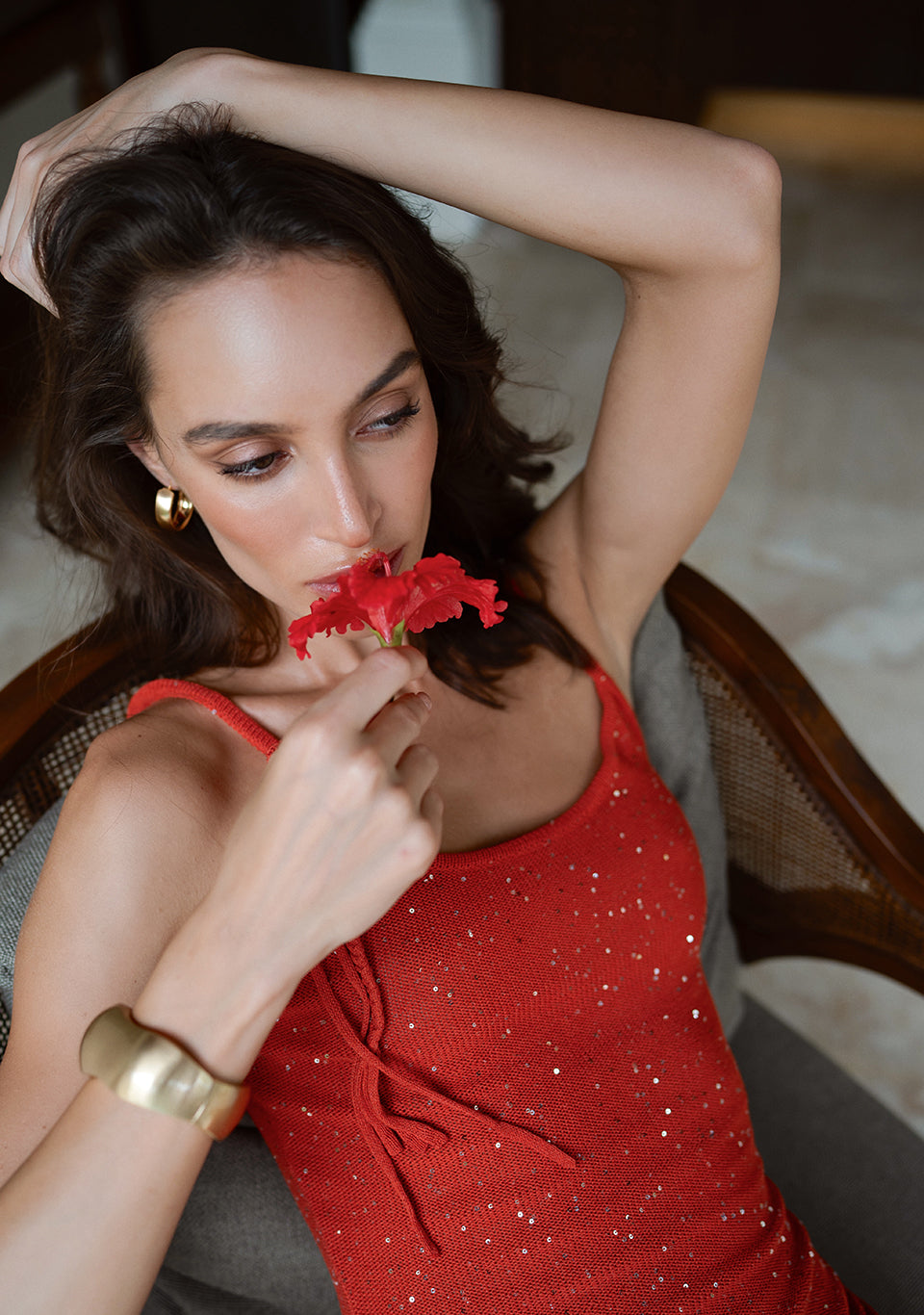 A form-fitting midi-length knit dress that gently accentuates the silhouette. Crafted from a soft knit fabric with fine sequins, it adds a subtle, elegant sheen. The material is incredibly soft and comfortable.