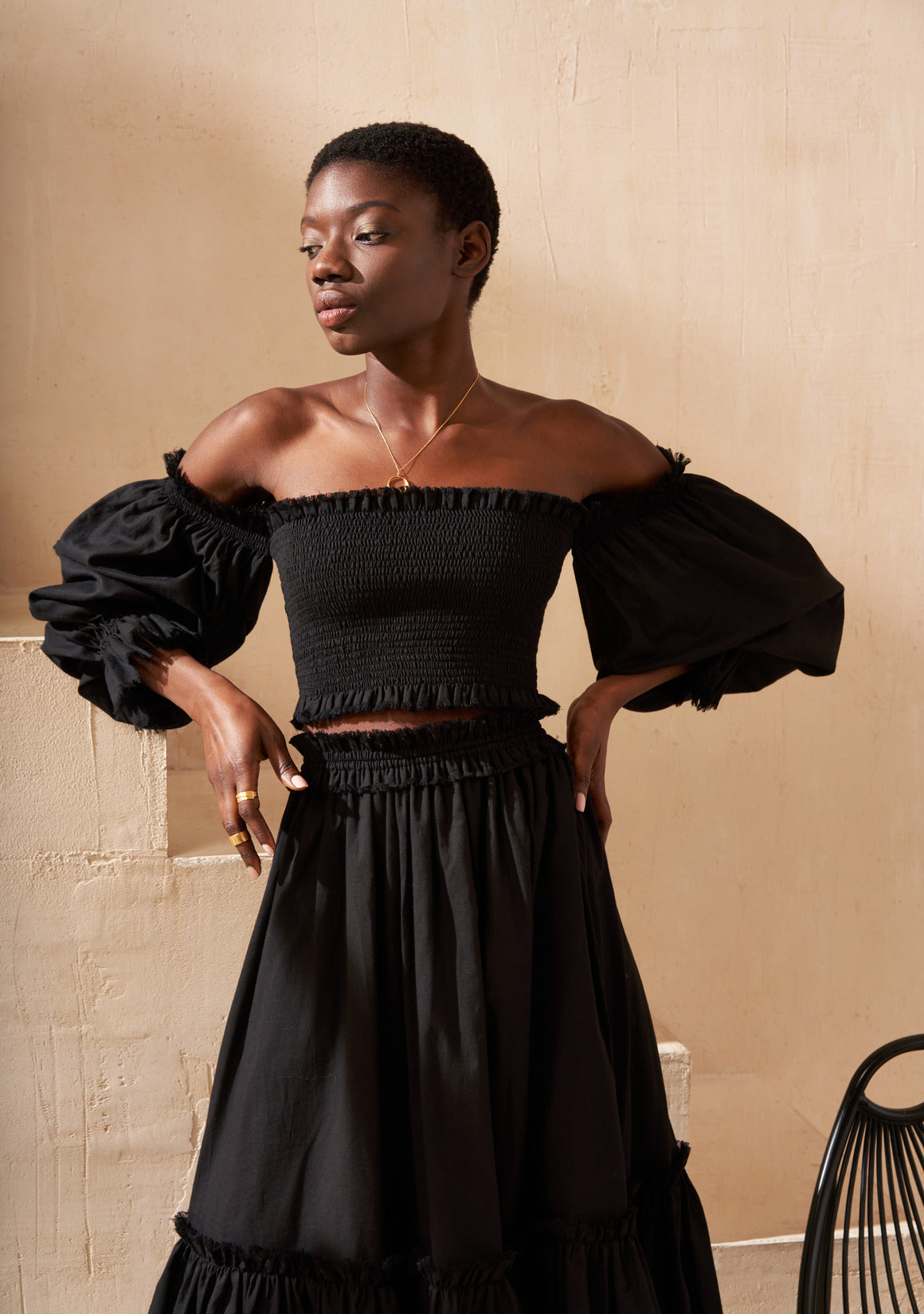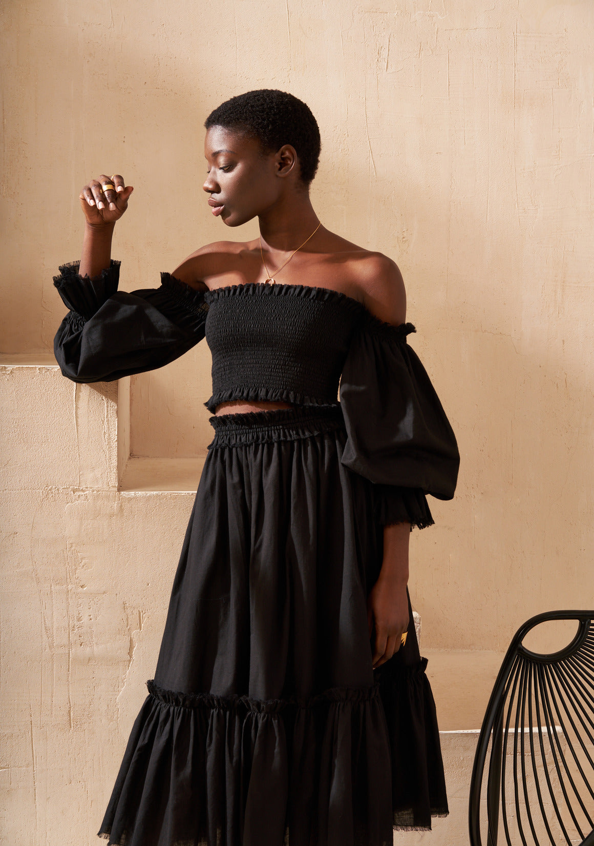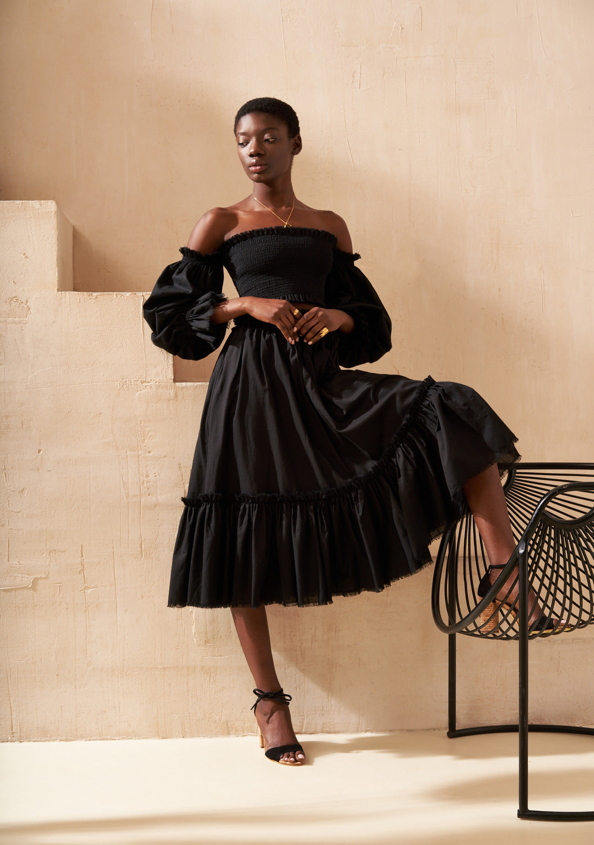 The skirt is light and airy, designed with a soft elastic waistband that gently drapes over the hips. Finished with graceful ruffles, it moves beautifully with every step.