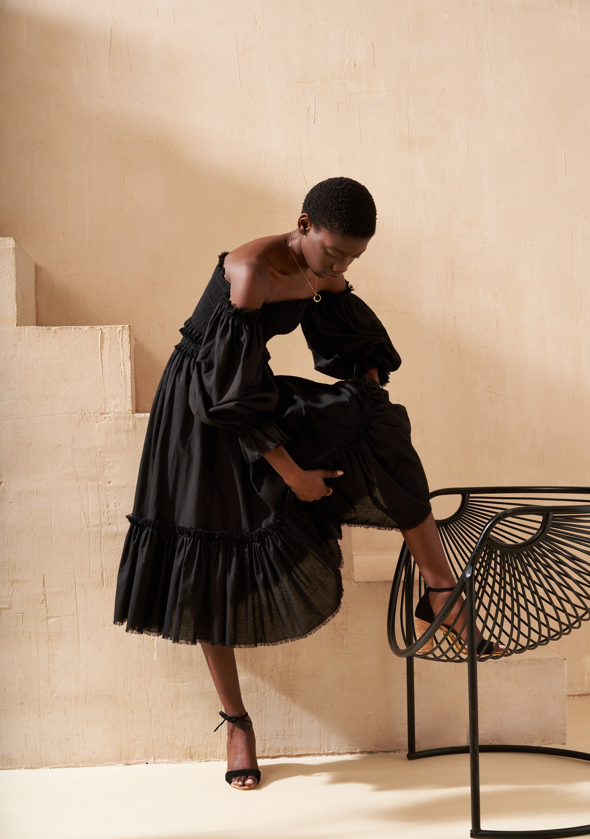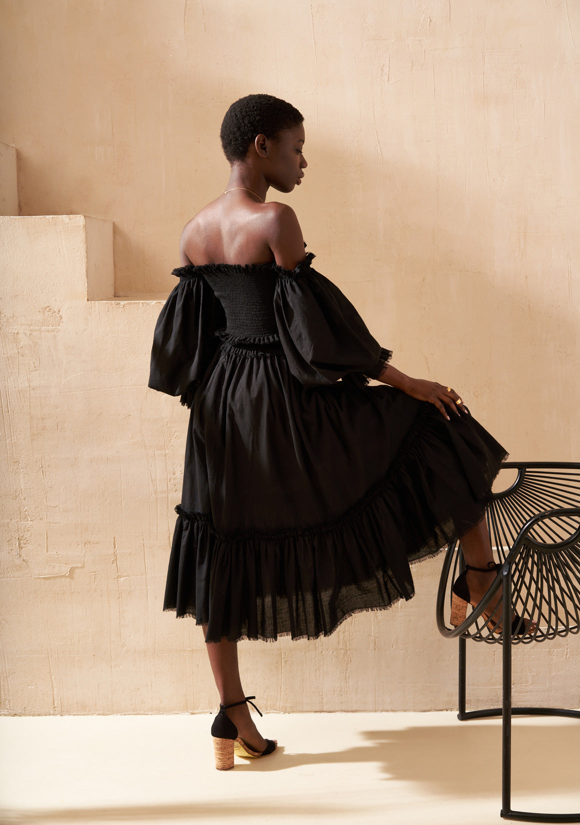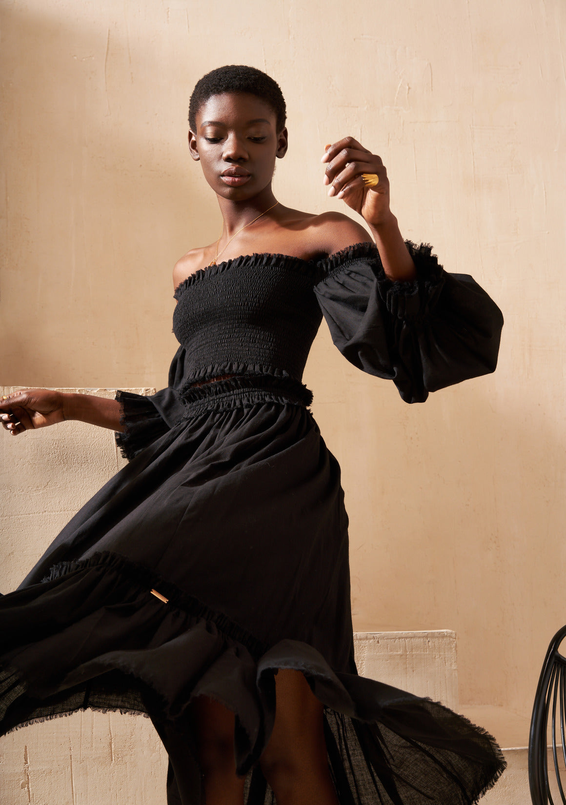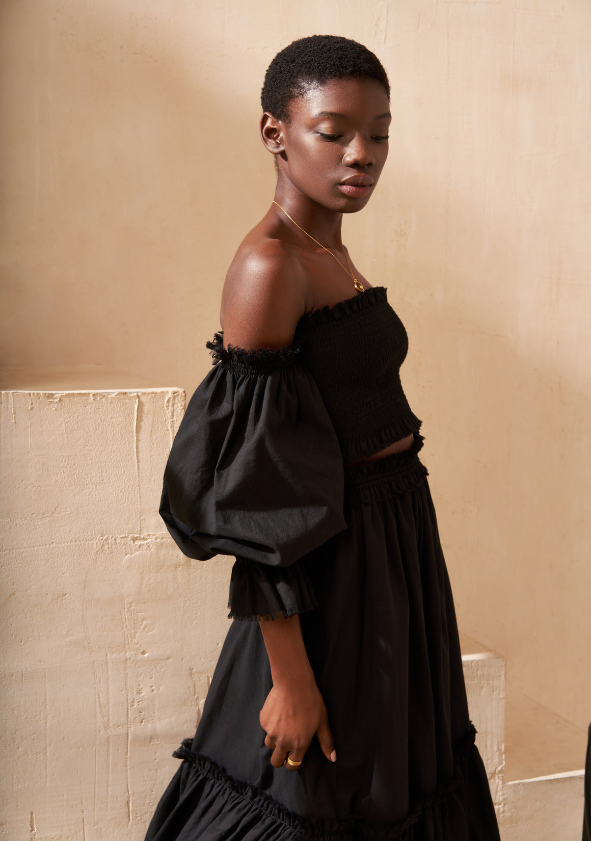 The skirt is light and airy, designed with a soft elastic waistband that gently drapes over the hips. Finished with graceful ruffles, it moves beautifully with every step.