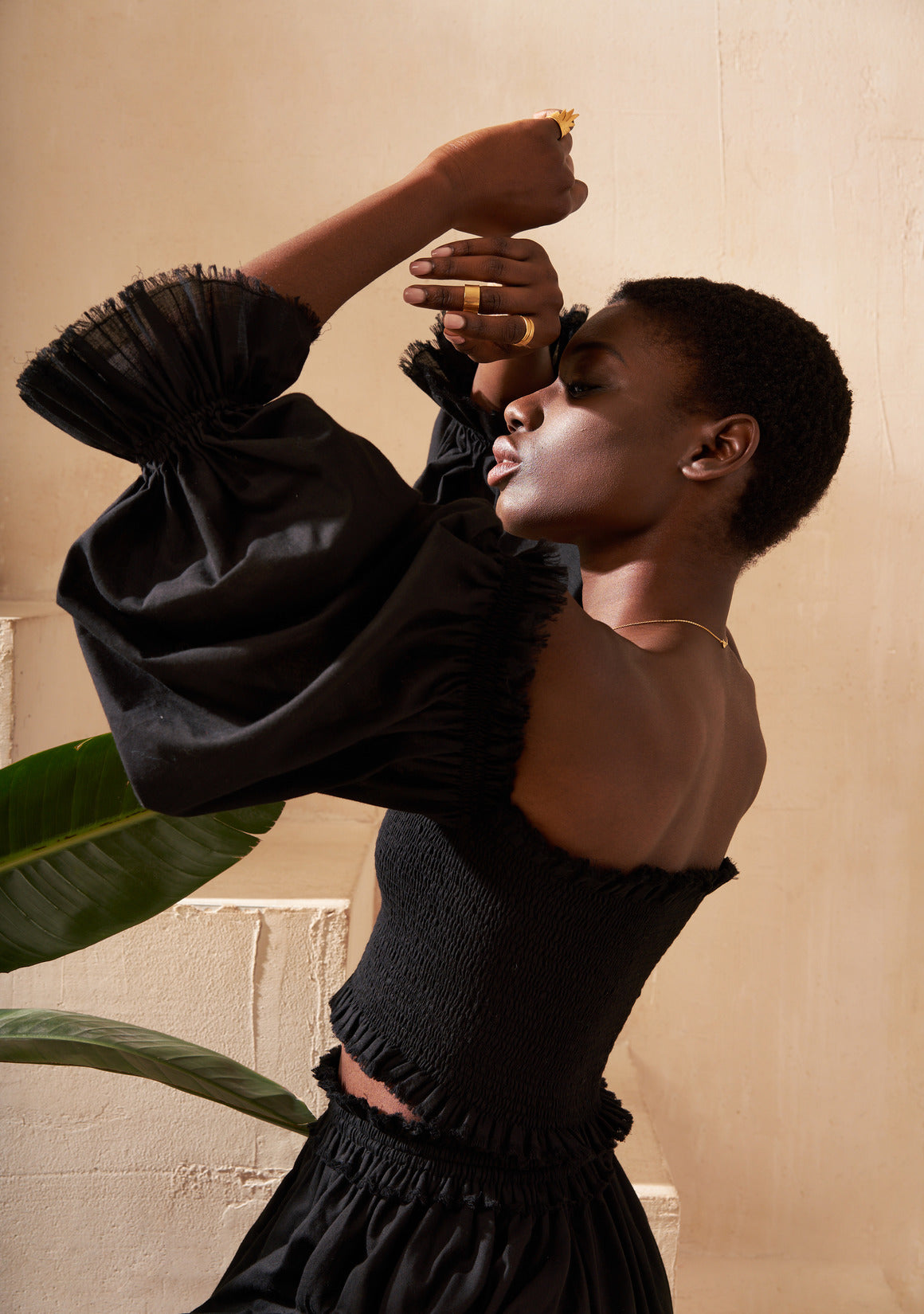 The top features voluminous puff sleeves that elegantly highlight the collarbones and shoulders, creating a delicate, feminine silhouette.