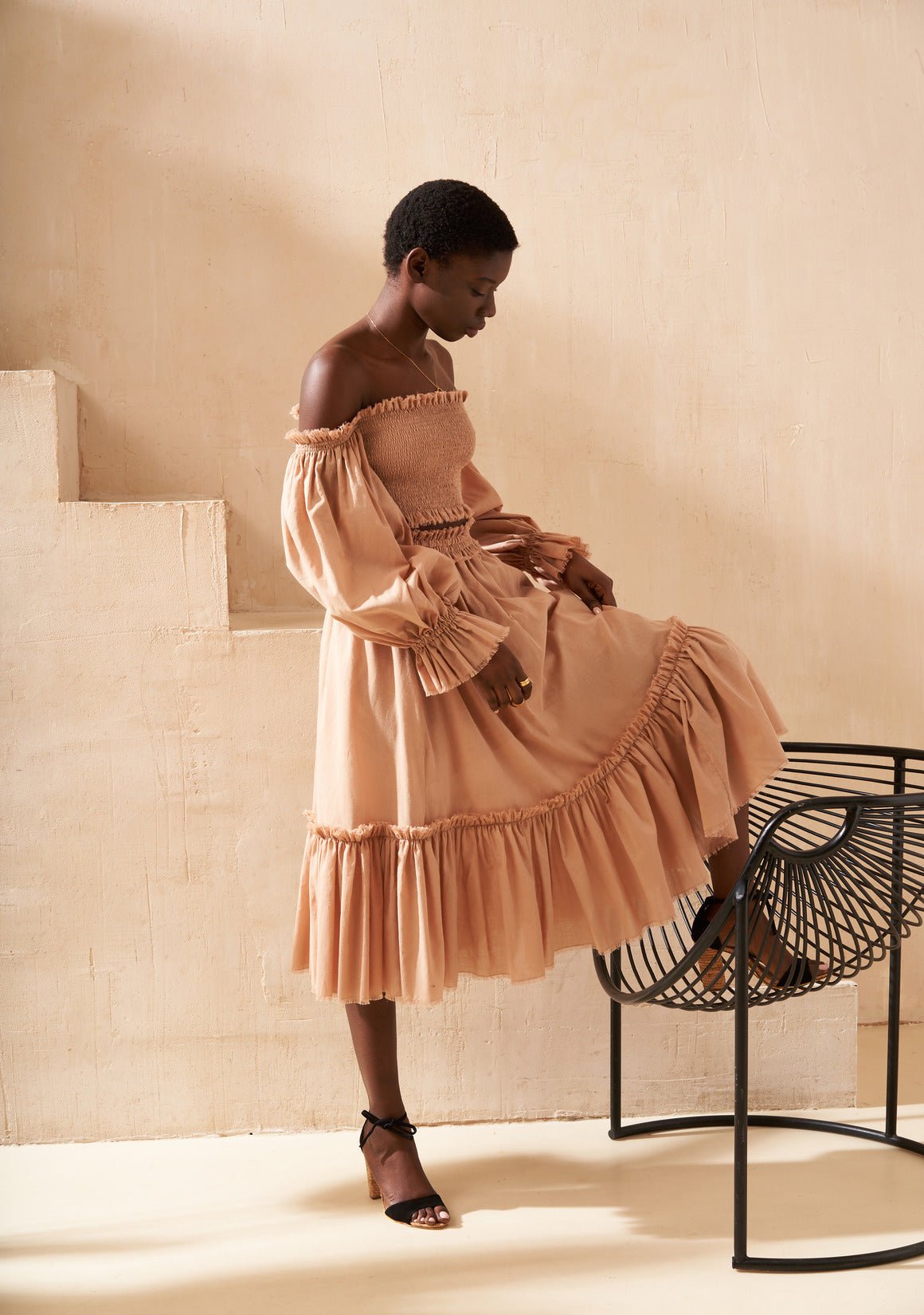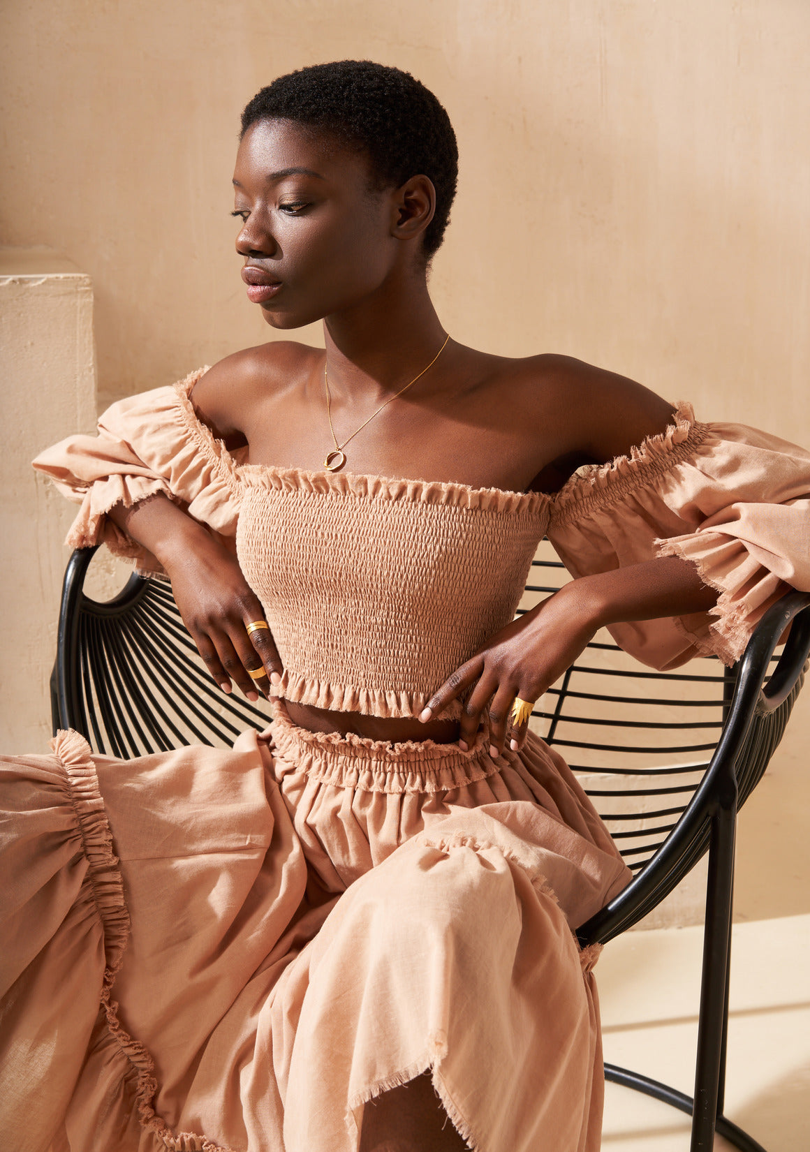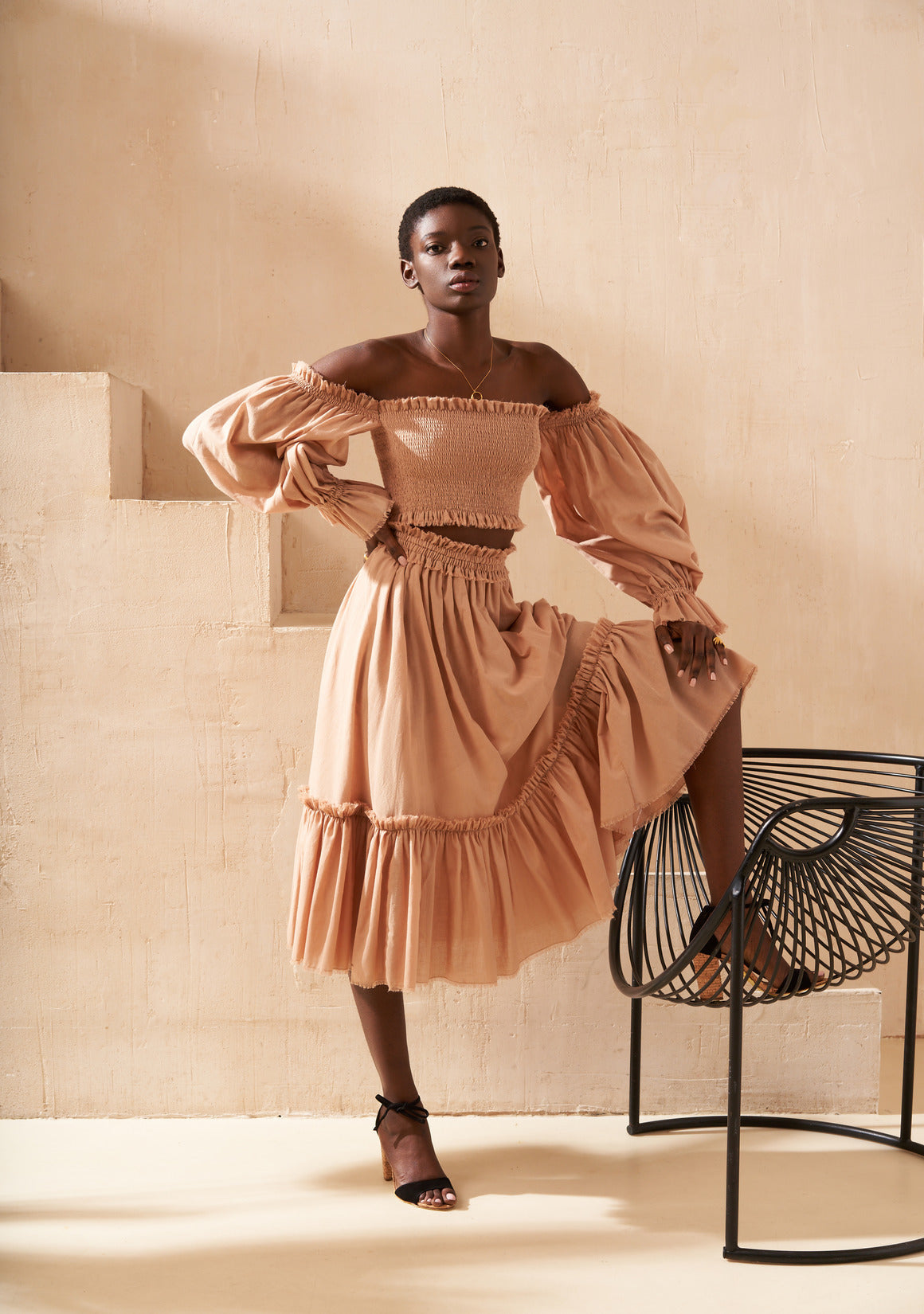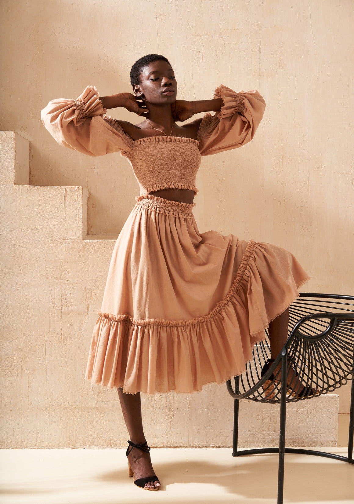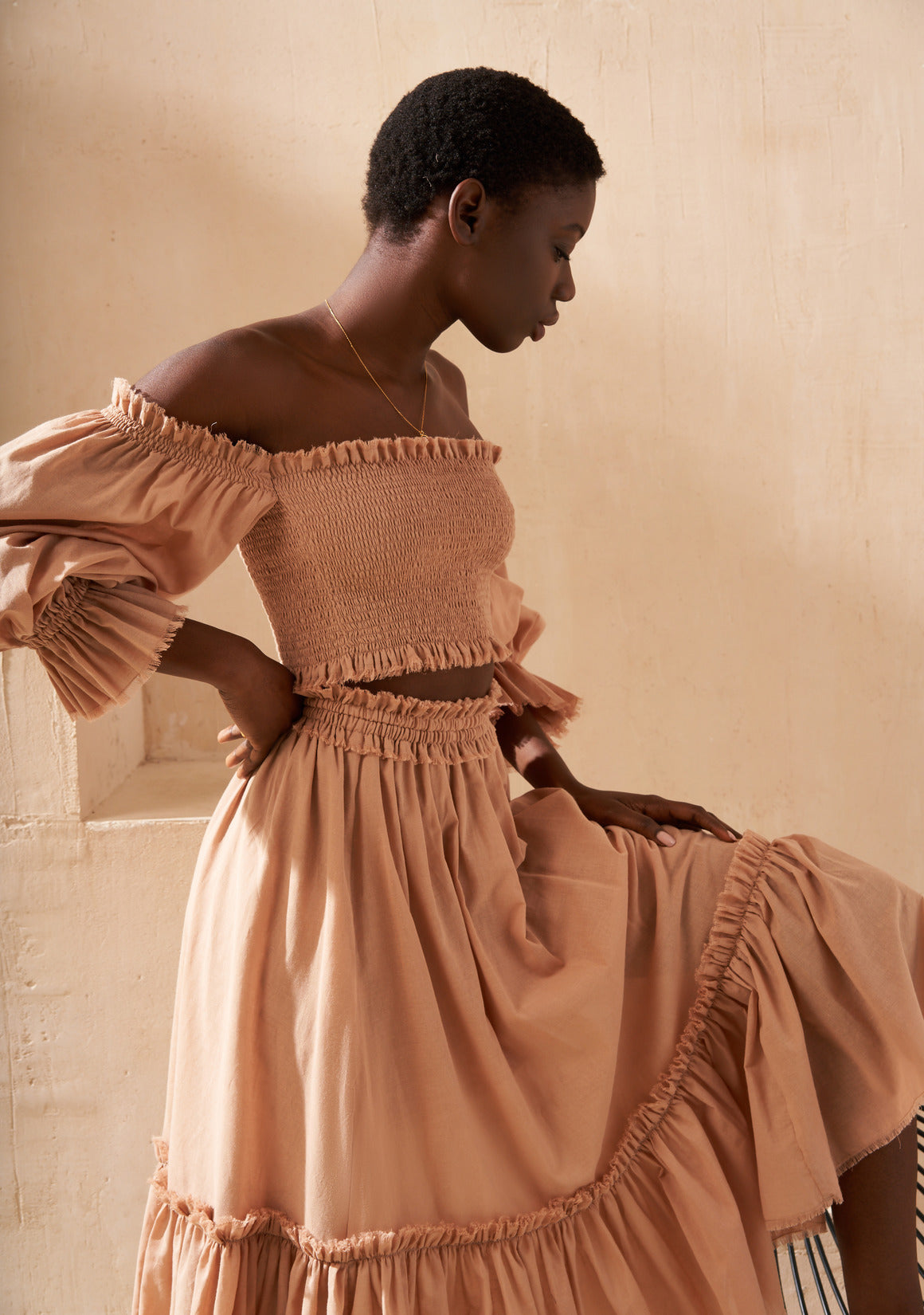 The skirt is light and flowy, with a relaxed elastic waistband that drapes naturally. Delicate ruffles complete the airy silhouette, making it perfect for warm days and graceful movement.