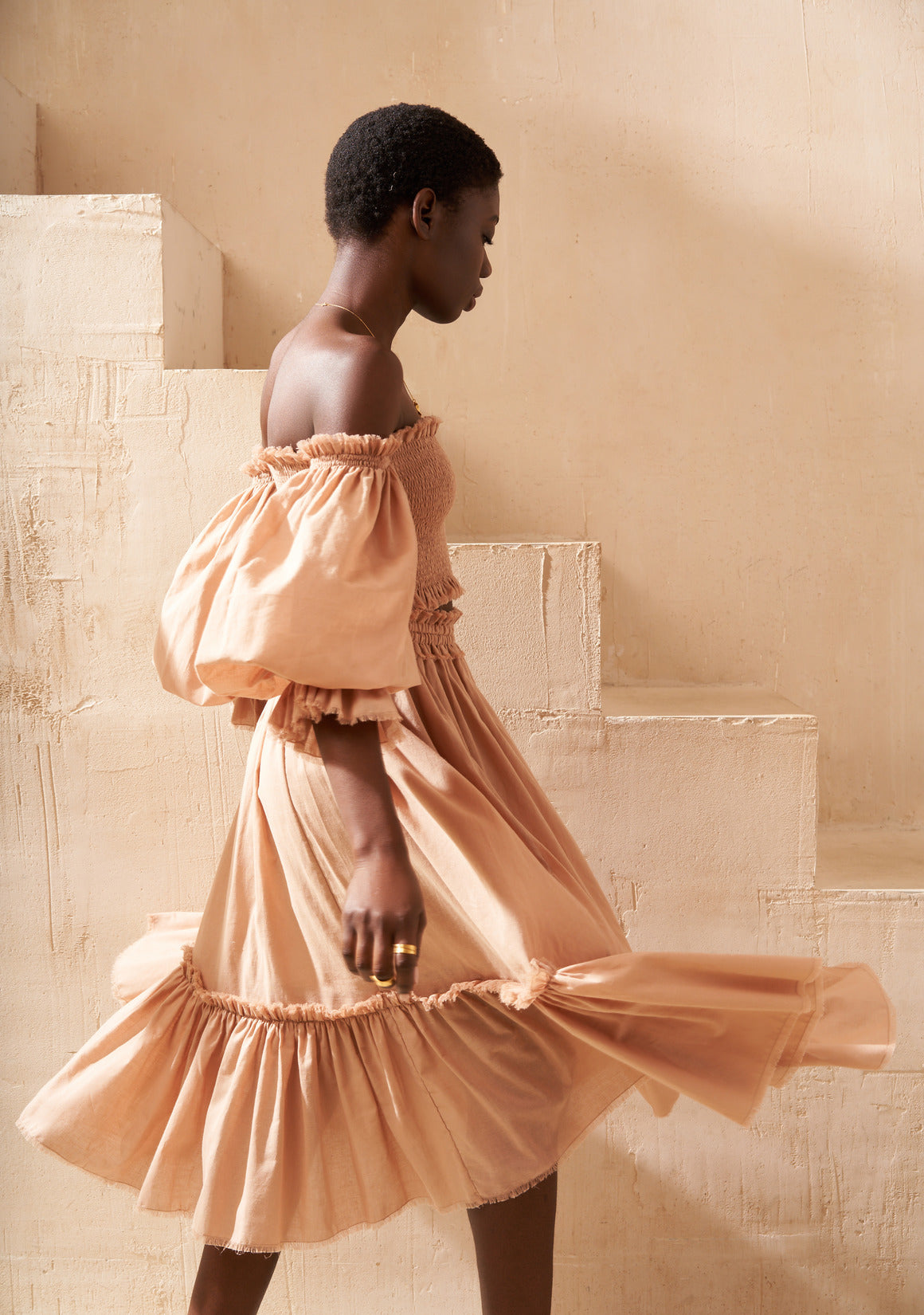 The top is designed with soft, voluminous puff sleeves that elegantly frame the shoulders and collarbones, adding a touch of romantic flair.