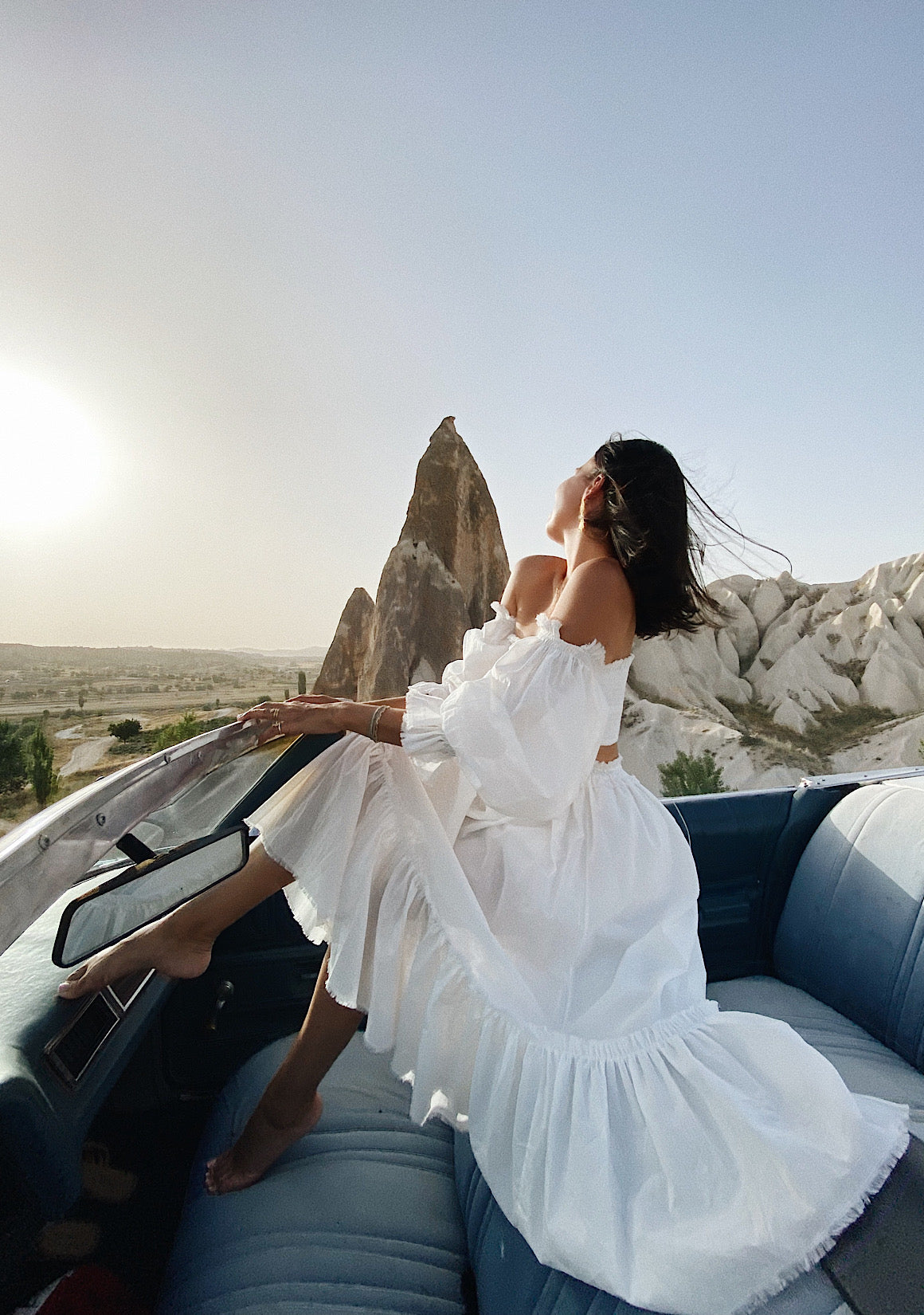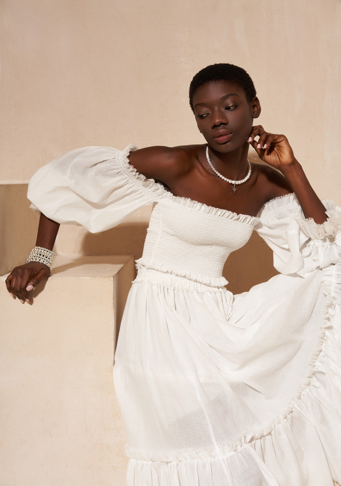 The top features voluminous puff sleeves that elegantly highlight the collarbones and shoulders, creating a delicate, feminine silhouette.