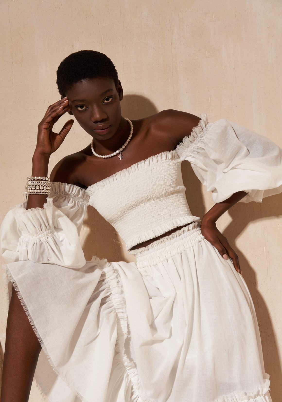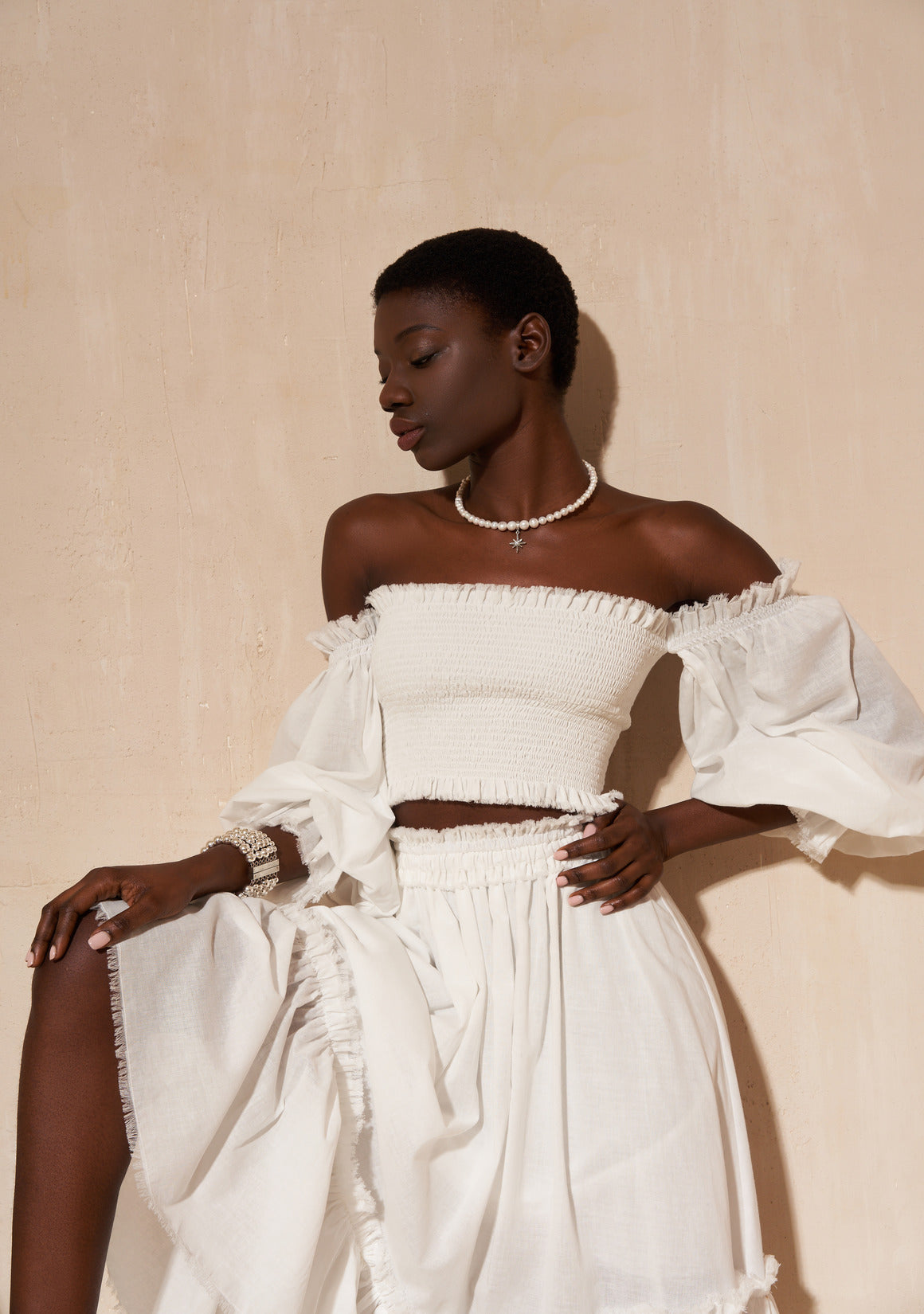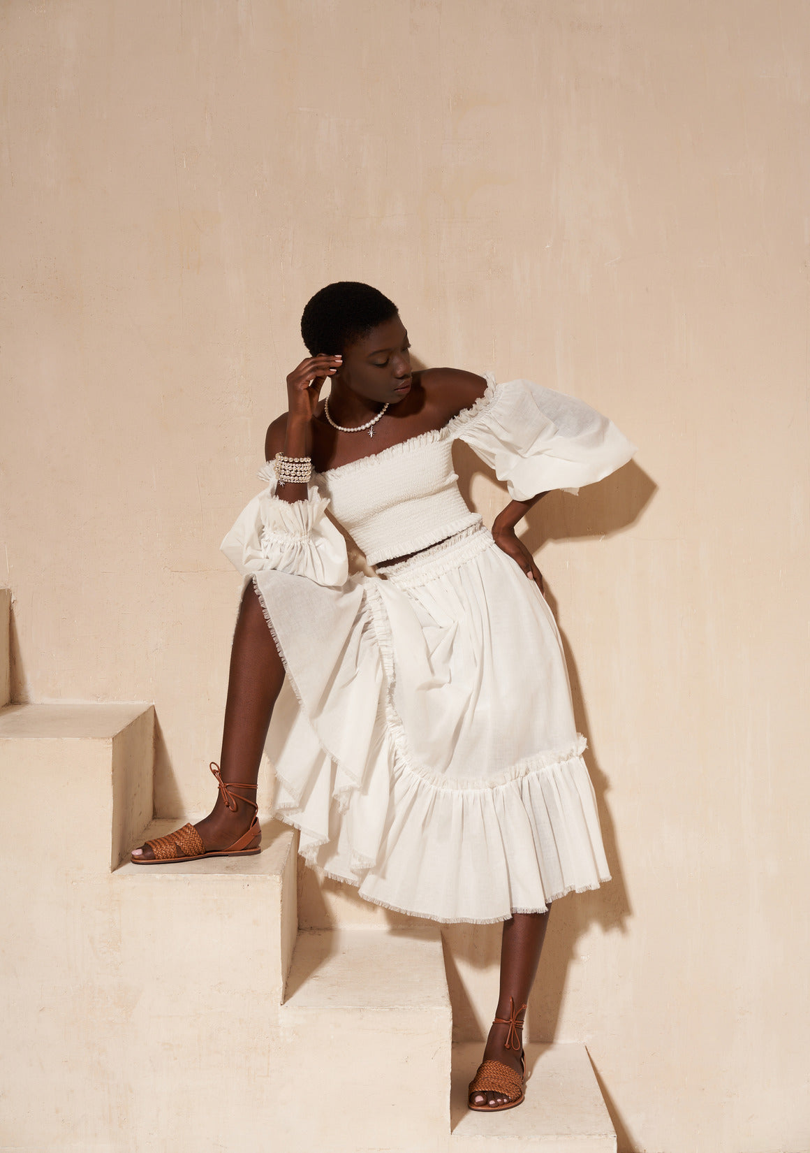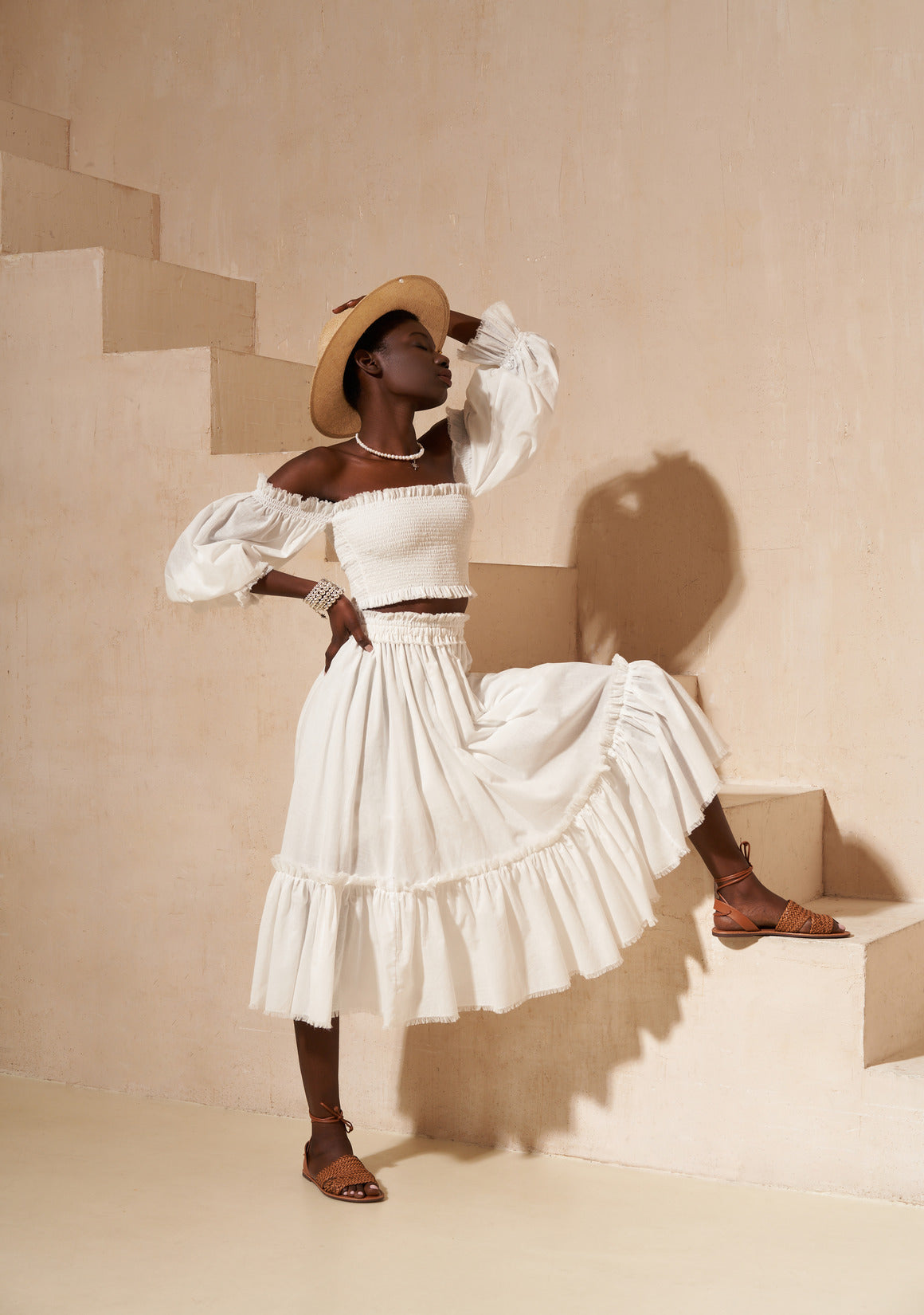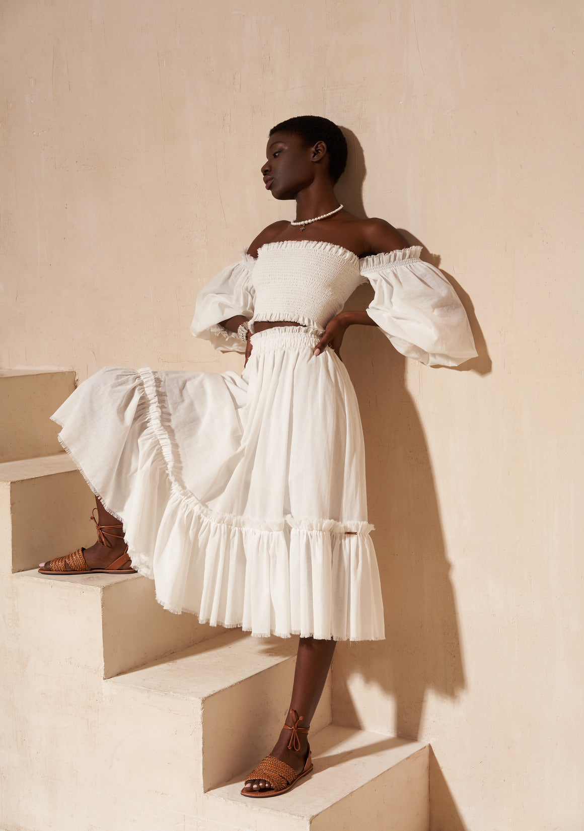 The skirt is light and airy, designed with a soft elastic waistband that gently drapes over the hips. Finished with graceful ruffles, it moves beautifully with every step.